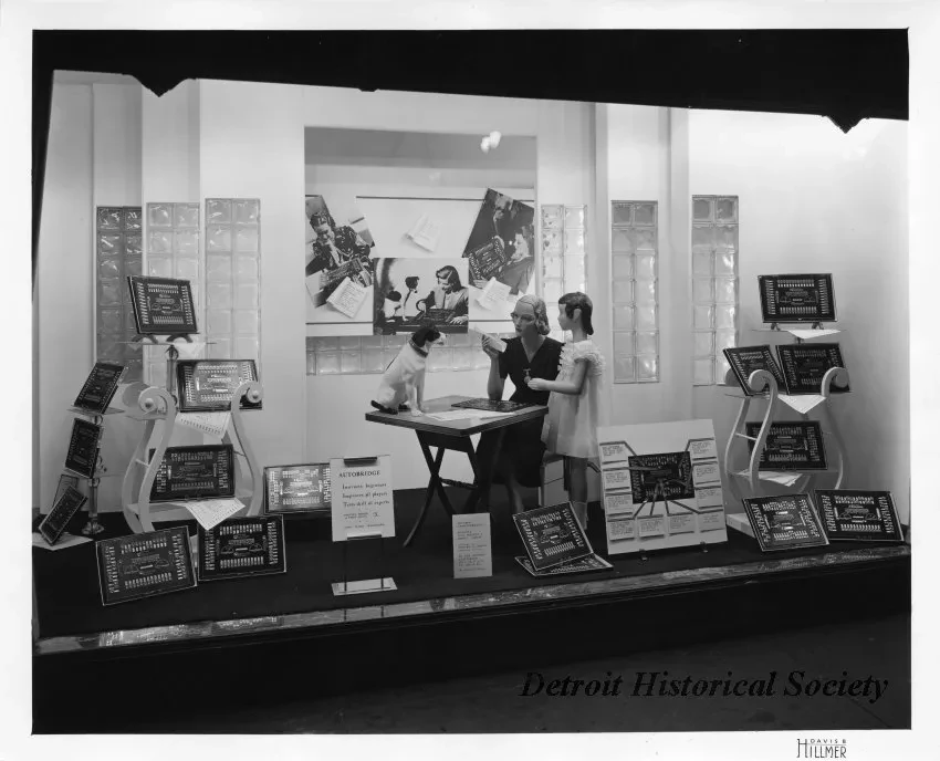 Print. Black and white photographic print of a window display for Autobridge at The J.L. Hudson Company Department Store. Featured in the display is a female mannequin who is sitting at a table reading the instructions, her daughter stands beside her and the dog is sitting atop the table. Several boards for Autobridge are displayed throughout the window including an instructional sign with the board adjacent to the mannequins, and images of people using Autobridge are featured in the background. Signage in the lower central foreground reads, "AUTOBRIDGE, Instructs beginners, Improves all players, Tests skill of experts - - Playing board and Four deals, $3 - - First Floor, Woodward." Also, a smaller sign is visible neighboring a table leg, it reads," Advance Announcement... Hudson's will present a bridge forum, Conducted by Edward C. Wolfe, Culbertson Lecturer, In the Hudson's Auditorium, July 26, 27, and 28, at 2:00 P.M., No Admission Charge." The photographer's name is printed on the bottom of the recto, "Davis B. Hillmer."