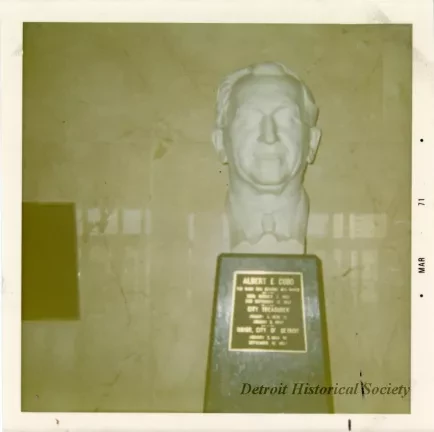 Request ImageColor photo of the bust of Albert E. Cobo inside of Cobo Hall. "Feb 71," is printed in the right border of the photo.