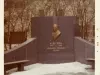 Color photo of the Alex Dow monument on the west corner of Grand River and First Street and Cass Avenue. The monument, designed by Marshall Fredericks, consists of a relief bust of Dow on a stone base. Snow is on the ground beneath the monument. The Detroit Edison Company Building stands in the background. "Feb 71," is printed in the right border of the photo.