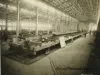 Sepia-toned photograph showing men manufacturing a keel for an Eagle Boat on wooden platform mounted on rails inside of the Ford River Rouge development. Small carts are in the background loaded with material. Lower right hand corner shows photo number and date of photo: 22076-5-11-18. Photo mounted on a linen backing.