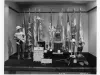 Print. Black and white photographic print of a window display at The J.L. Hudson Company Department Store, for the 2nd International Model Plane Contest. A young boy stands proud with his model airplane, while observing the differing trophies varying and plaques in size and shape, which will be awarded at the event. Model airplanes are also visible in the central foreground and hanging from the ceiling. Signage featured in the window reads, "2nd International Model Plane Contest Sponsored by Plymouth Motor Corporation, In Conjunction with the Aero Club of Michigan, August 18 to 23, 1948, Detroit." Also, "Choose Your Model Kit From the Large Selection on Our 12th Floor." A series of international flags adorns the rear of the display. The date, photographic sequence number, company name, and photographer's name is printed on the bottom of the recto, "8-16-48; 23683-x; The J.L. Hudson Company; Photography by Davis B. Hillmer."