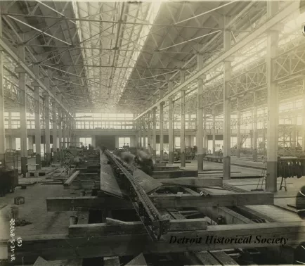 Sepia-toned photograph depicting workers attaching plates to the keel of an Eagle Boat within the Ford River Rouge Complex. A coat rack and an attached shelf holding lunch pails are visible. The caption, "Plating at Keel as seen from stern," is on the verso. Lower right hand corner shows photo number and date of photo: 22268-5-31-18 with a number 5 written above the date. Photo mounted on a linen backing.