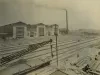 Sepia-toned photograph depicting an elevated overview of the transfer bed at the Ford Rouge Factory Complex where workers are making final adjustments. A crane is mounted on a railcar in the foreground. Building "B" in background, and to the right the power house is producing smoke from it's stack. Lower right hand corner shows photo number and date of photo: 22526-6-26-18. Photo mounted on a linen backing.
