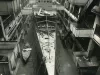 Sepia-toned photograph depicting the manufacture of the pattern Eagle Boat at the Ford Highland Park Factory, as viewed from a point above its bow, facing toward its stern. The boat appears near completion. A lifeboat is at the lower left. This pattern boat was later dismantled and used as a template for Eagle Boats to be manufactured at Ford's River Rouge Complex. The caption, "First study-model Eagle built at Ford Highland Park plant," is on the verso. Lower left hand corner of photo has number and date of photo: 22688-7-18-18. Photo mounted on a linen backing.