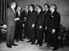 Black and white photograph of Mayor Roman Gribbs standing on the left presenting a portfolio binder to a group of seven Slovak Detroiters (all men) in a carpeted office room. Gribbs is wearing a light pinstripe suit and all other men are wearing darker suits. A stamp on the verso reads, "D.F.D. PHOTO, BY CAPT. J. A. MANCINELLI," and a handwritten caption reads, "A group of Slovak Detroiters."