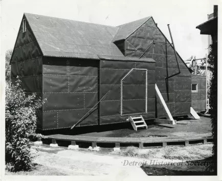 Black and white photo of Thomas Edison's Black Maria, his Kinetoscope movie studio on the grounds of his laboratory at West Orange, New Jersey. The building is completely covered in dark material, and the circular track on which the building rotated can be seen surrounding it.