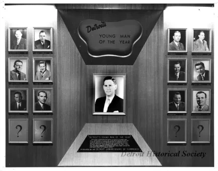 Black and white photographic print of Detroit's Young Man of the Year recognition wall, exhibited at the Detroit Historical Museum. Photographs of dignified Detroiters are displayed on the left and right side of the wall, with one large photograph of the 1954 honoree, George W. Matthews, displayed in the center. Signage below the photo of Mr. Matthews reads, "Detroit's Young Man of the Year: Each year a representative group of Detroit's business and civic leaders meet to select the young man between the ages of 21 and 35, who by his outstanding record of community service and his demonstration of initiative and leadership ability, best deserves the title, 'Outstanding Young Man of the Year.' These men, the award winners of yesterday and today, makes certain the continued vitality of 'Dynamic Detroit.' Sponsored by the Detroit Junior Board of Commerce." Typed on the verso, "Hall of Citizenship, Young Man of the Year exhibit, 1954 - George W. Matthews, Wayne U. Photo."