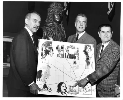 Black and white photographic print of (from left to right) Dr. Dewey F. Barrish, Chairman of Michigan Week; Robert M. Surdam, President, National Bank of Detroit; and Henry D. Brown, Director, Detroit Historical Museum; examining a map which features a historic tour of the city of Detroit, as noted on the verso. A bust of Cadillac is visible in the background.