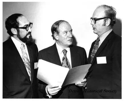 Black and white photographic print (left to right) unidentified conference attendee; Mr. John Fisher, Canada's Centennial Commissioner; and Mr. Solan W. Weeks, Coordination Director, Detroit Historical Commission; , in attendance at the Local History Conference, held on the campus of Wayne State University, April 1972.