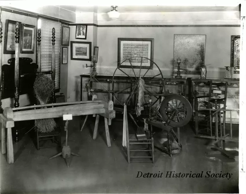 Black and white photographic print of artifacts displayed in Barlum Tower; the original location of the Detroit Historical Museum; artifacts displayed include a variety of home furnishings, a spinning wheel, framed portraits, and oil lamps. Typed on the verso, "Detroit Historical Museum Quarters in the Barlum Tower." Also, the photographer's name is stamped on the verso, "L.B. Van Vliet & Co., Commercial Photographers, Whittier 1579, 7909 Mack Avenue, Detroit, - Mich."