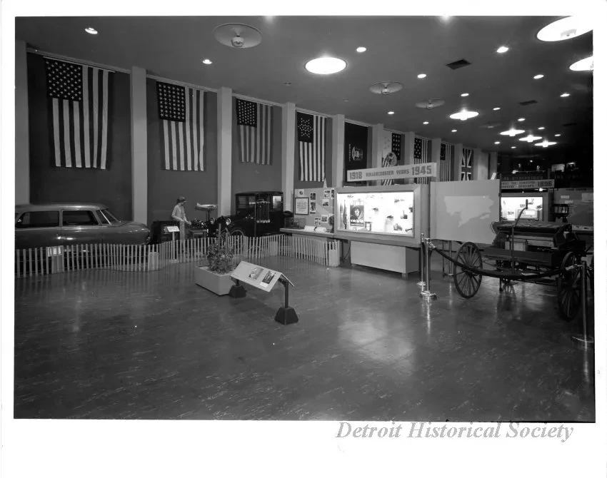 Black and white photographic print of an interior view of the "Detroit How You Have Changed," exhibit, which displays artifacts from the inception of the automobile, radio, air travel, and the war years.