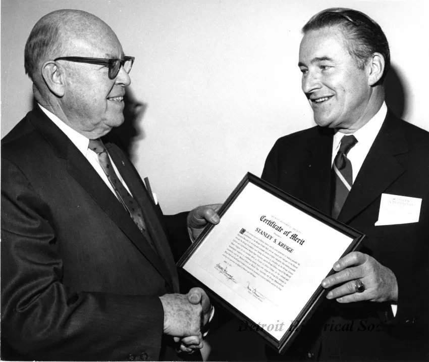 Black and white photographic print of Mr. Stanley S. Kresge receiving a "Certificate of Merit" from Awards Chairman and Detroit Historical Trustee Walter J. Murray; at the Local History Conference, April 17, 1971.
