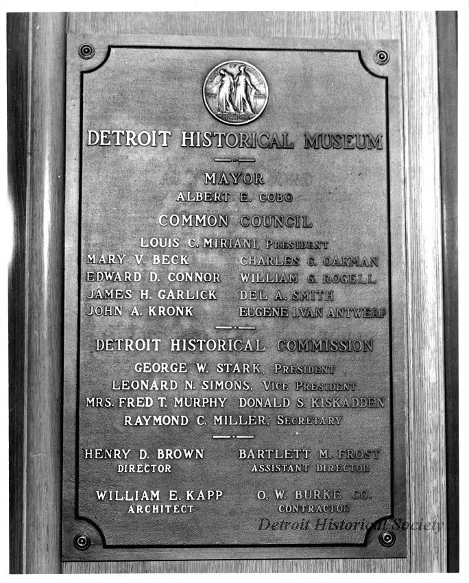 Black and white photographic print of a plaque affixed to a wall inside the Detroit Historical Museum acknowledging the many people involved in the museum. The plaque reads, "Detroit Historical Museum; Mayor Albert E. Cobo; Common Council Louis C. Miriani, President; Mary V. Beck; Edward D. Connor; James H. Garlick; John A. Kronk; Charles G. Oakman; William G. Rogell; Del A. Smith; Eugene I. Van Antwerp; Detroit Historical Commission, George W. Stark, President; Leonard N. Simons, Vice President; Mrs. Fred T. Murphy; Donald S. Kiskadden; Raymond C. Miller, Secretary; Henry D. Brown, Director; Bartlett M. Frost, Assistant Director; William E. Kapp, Architect; O.W. Burke, Co., Contractor."