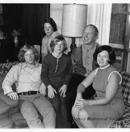 Black and white photographic print of Mr. Thomas J. Young, Jr., retired city of Detroit firefighter who was honored by the Detroit News as Fire Fighter of the Month at the Detroit Historical Museum; Mr. Young is seated in his home with his family. Typed on the verso, "Fire Fighter of the Month, 10/24/72."