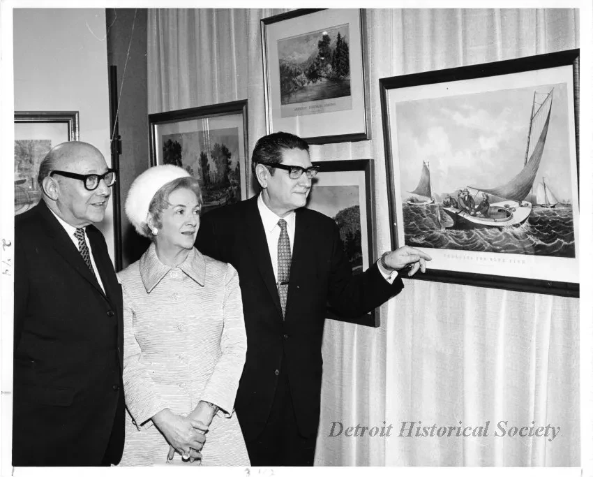 Black and white photographic print of Mr. Leonard Simons (left) and Mr. Henry D. Brown (right), standing on either side of an unidentified woman, looking at framed artwork exhibited at the Dossin Great Lakes Museum.