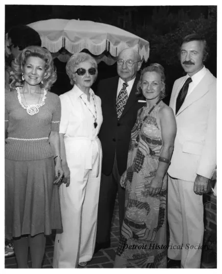 Black and white photographic print of Mr. Leonard Simon (center) stands with members of his family during the Detroit Historical Society Guild's party in honor of Mr. Simon.