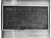 Black and white photographic print of a historic marker noting President John F. Kennedy's last appearance in the city of Detroit in front of the Sheraton-Cadillac Hotel; the plaque reads, "John Fitzgerald Kennedy, Thirty-Fifth President of the United States of America made his last appearance and address to a Detroit audience at this location on Oct. 6, 1962; God Rest His Soul."