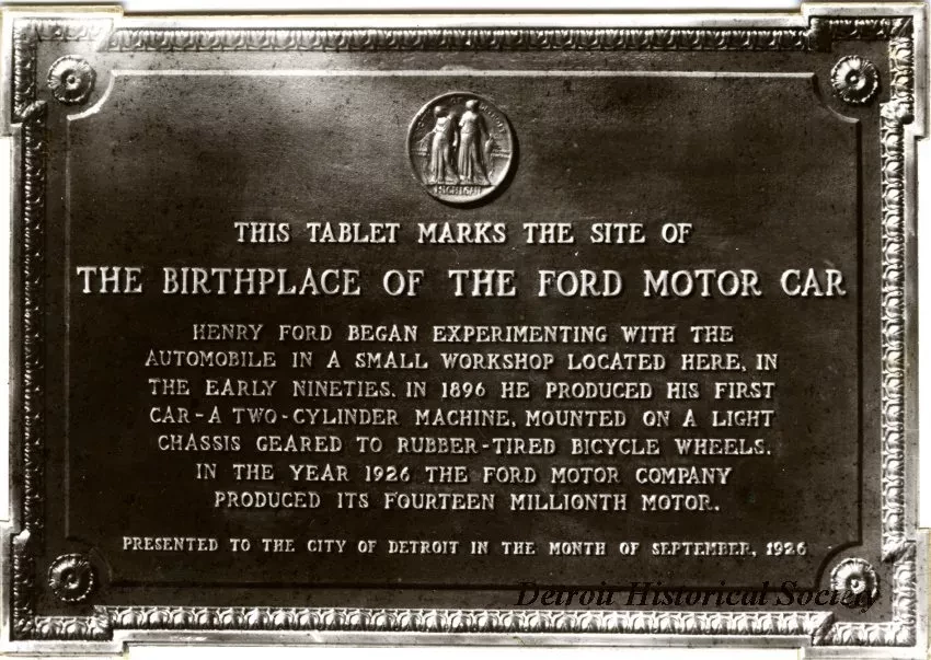 Black and white photographic print of a plaque noting the birthplace of the Ford Motor Company, at Henry Ford's Bagley Avenue home workshop; the plaque reads, "This Tablet Marks the Site of the Birthplace of the Ford Motor Car. Henry Ford began experimenting with the automobile in a small workshop located here, in the early nineties. In 1896, he produced his first car - a two-cylinder machine, mounted on a light chassis geared to rubber-tired bicycle wheels. In the year 1926, the Ford Motor Company produced its fourteen millionth motor. Presented to the city of Detroit in the month of September, 1926."