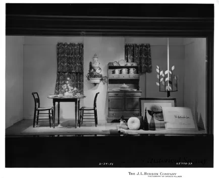 Print. Black and white photographic print of a window display featuring a small dinette set, and sideboard at The J.L. Hudson Company Department Store. Featured atop the dining room table are ceramic dishes, flatware, and a floral arrangement; patterned ceramic service ware is featured atop the sideboard. Seat cushions, a small ceramic pitcher, and two darkly colored curved glass bottles, are featured in the right foreground adjacent to signage which reads, "Hudson's and House & Garden present Fruit and Flower colors for Spring 1954, Sharp and Sweet, The Watermelon Look, for gracious country dining... China and Glass, 10th Floor, Maple Furniture, 9th Floor Farmer, Section C, Curtains, 8th Floor Grand River, Section A." A framed image of watermelons is visible behind the signage. The date, photographic sequence number, company name, and photographer's name is printed on the bottom of the recto, "2-24-54; 25798-3x; The J.L. Hudson Company; Photography by Davis B. Hillmer."