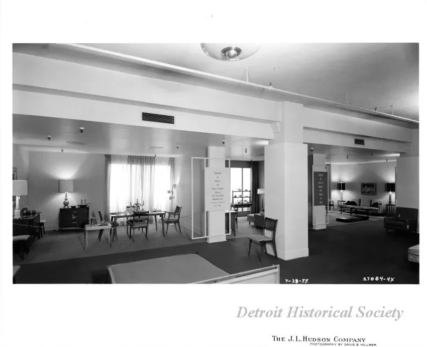 Print. Black and white photographic print of three differing interior room settings at The J.L. Hudson Company Department Store. The room setting visible on the left side of the image features a dining room set including sideboard and cabinetry; the central room setting features an office space with desk, shelving and seating; lastly, the third room setting features a living room space with couch, end tables, lamps, and coffee table. A bed is featured in the central foreground. Signage affixed to pilasters separating the displays read, "Decorated by Hudson's and House & Garden located at 6514 Castle Drive, Bloomfield Twp. 1/4 mi. west of Telegraph Road off W. Maple; Selected for House & Garden's 1955 House of Ideas." The date, photographic sequence number, company name, and photographer's name are printed on the bottom of the recto, "7-28-55; 27084-4x; The J.L. Hudson Company; Photography by Davis B. Hillmer."