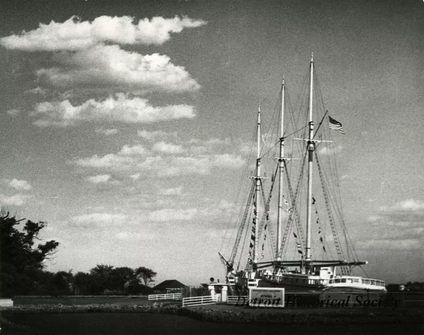 Black and white photographic print of the stern and port side of the schooner J.T. WING moored off the coast of Belle Isle in the Detroit River, and served as a maritime museum attraction. Signage affixed to the fencing surrounding the perimeter of the vessel reads, "Museum of Great Lakes History, J.T. Wing." The visitor's entrance is flanked by white fencing and a guard shack; stairs leading to the main deck of the three-mast schooner is also visible. The rigging is ornamented with differing types of maritime flags.