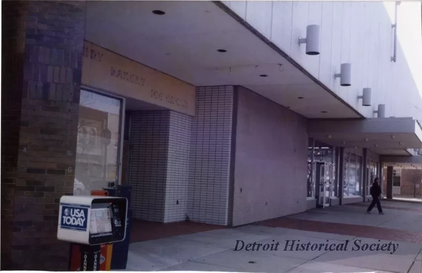 Color photo of the exterior of the Sanders store on North Woodward Avenue in Birmingham, taken from the sidewalk to the north. USA Today, Detroit News, and Detroit Free Press boxes are stationed outside the entrance at the lower left corner of the photo. A woman exits an adjacent business in the background on the right.