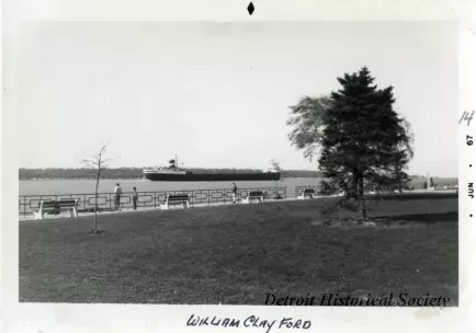Black and white photo of the Ford Motor Company Marine Division freighter WILLIAM CLAY FORD heading up the Detroit River as taken from a park on the Canadian side of the river, off of its starboard quarter. A grassy field, a tree, a row of benches, a small fence, and several park goers are in the foreground, and a tree-lined shore is in the background. A handwritten note is on the verso: