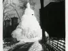 Black and white photographic print depicting the ice fountain in the median of Washington Boulevard. In the foreground are benches