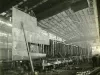 Sepia-toned photograph taken to document the effort to set a new record time for boat construction through the manufacture of Eagle Boat No. 59. Workers, assisted by an overhead crane set the top plates onto the hull, within building "B" of the Ford River Rouge Factory Complex, as viewed from off the boat's port bow. Workers on ladders spacing the framing along the boat's port side. The time of photo is 12:30 pm. Lower right hand corner show number and date of photo: 26299-04-02-19 with a #59 and 12:30 pm written above. Photo mounted on a linen backing.