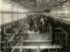 Sepia-toned photograph taken to document the effort to set a new record time for boat construction through the manufacture of Eagle Boat No. 59, within building "B" of the Ford River Rouge Factory Complex, as viewed from above the boat's stern. Workers stand atop the boat's newly completed decks. "#59, 26372-04-07-19," is printed in the lower left corner of the recto and "8A-11 Decks Complete," is handwritten on the verso. The photo is mounted on a linen backing.