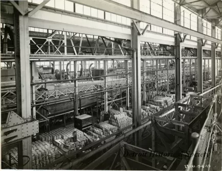 Sepia-toned photograph taken overlooking stacks of barrels of rivets within building "B" of the Ford River Rouge Factory Complex, as taken from on deck of an Eagle Boat under construction in the building. Four other Eagle Boats are also under construction in adjacent aisles in the background. "27141-7-8-19," is printed in the lower right corner of the recto, and "Rivets," and "13," are handwritten on the verso. The photo is mounted on a linen backing.