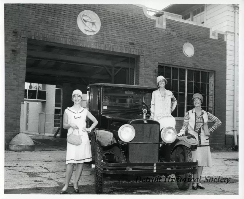 Black and white photograph of three women, all clad in 1920s-style clothing, posing with a Rickenbacker car in front of the Rickenbacker Motor Company building on Cabot Street. The lady to the left of the car has her left hand on her waist and her right hand holds a purse in front of her. The other two women are to the right of the car, each with their right hand on the car and their left hand on their waist. Two figures watch through the windows of an elevated walkway visible beyond the back bay door of the factory's garage.