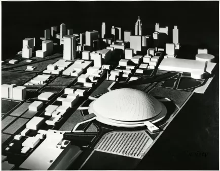 Black and white photograph showing an architectural model of a proposed domed stadium along riverfront, west of Cobo Hall and south of W Fort Street, with a view to the northeast. The stadium was to be home to the Detroit Tigers and the Detroit Lions.