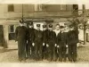 Sepia-toned group portrait photo of seven uniformed Detroit Fire Department firefighters, and one man in a light colored shirt and cap, posed on the lawn in front of the fire station for the fire boat JAMES R. ELLIOT. A portion of a boat moored to a bollard, is visible in the background on the right. "Old Fire Boat Fire House, the Old Elliott," and "958," are handwritten on the verso.