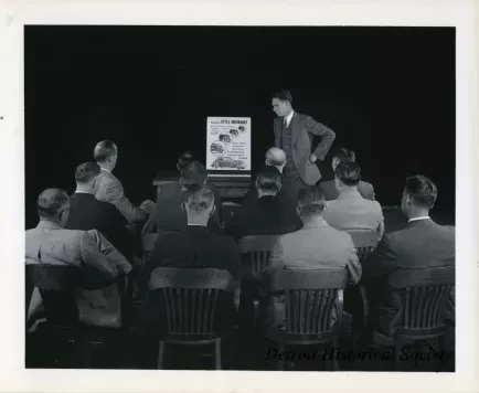 Black and white photographic print showing a Packard Motor Car Co. service meeting. the photograph was taken from the back of the meeting, and shows the backs of 12 men sitting in chairs and the front side of one man standing at the front of the group near a table. On the table is a sign featuring images of five Packard style cycles and reading as follows: