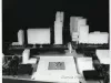 Black and white photographic print depicting a detail of an incomplete architectural model of a proposed design for Civic Center Plaza. It shows a view across the plaza, facing north from the Detroit River.