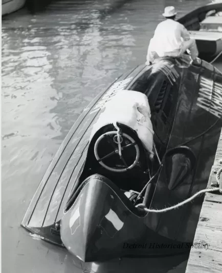 Black and white photo of hydroplane, ARADAM, from Italy, at the dock with Italian flags on the stern cowling.