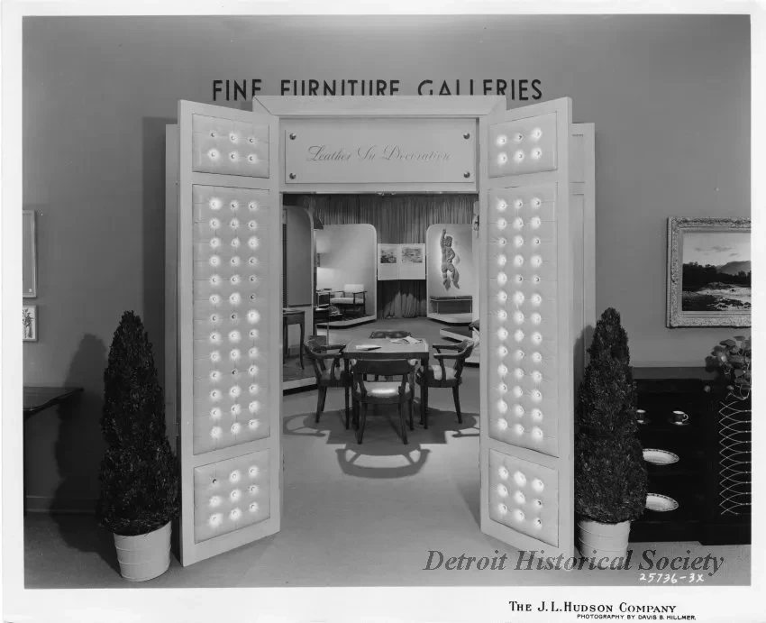Print. (2 Copies.) Black and white photographic print of the entryway to the Leather In Decoration Department of the Fine Furniture Galleries at The J.L. Hudson Company Department Store. An illuminated and padded door way leads to the leather furniture gallery featuring leather chairs, and couches in differing shapes and sizes. The photographic sequence number, company name and photographer's name are printed on the bottom of the recto, "25736-3x; The J.L. Hudson Company; Photography by Davis B. Hillmer."