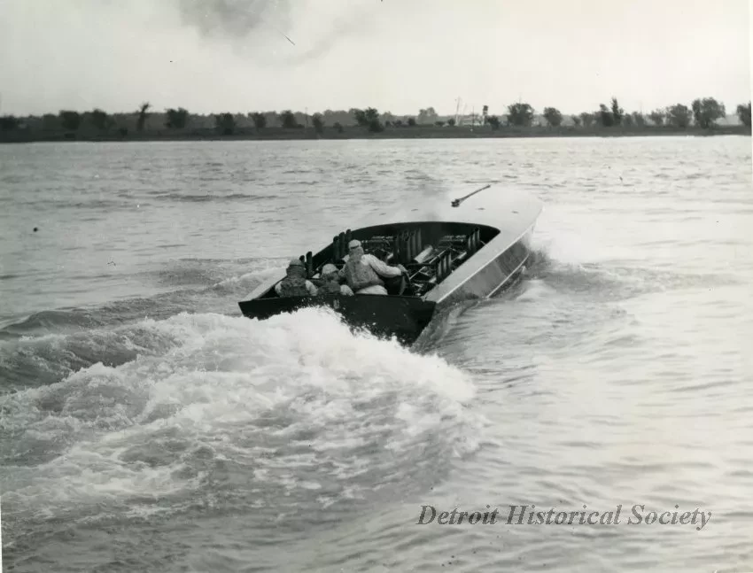 Black and white photo of MISS AMERICA X, taken from behind the boat as it is leaving the dock. Three men are in the cockpit with the driver, probably Gar Wood, standing and leaning over to adjust something.