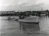 Black and white photo of MISS GOLDEN GATE III being towed out of Kean's Marina onto the Detroit River. Other pleasure boats at the marina can be seen in the background at right and a crowd of spectators in the background at the left. Pilot and mechanic can be seen in the boat, probably Dan Arena, her owner and driver, and Danny Foster his friend and mechanic in 1946.