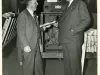 Black and white photograph of James L. Mahon talking to another man in front of a Civil Defense Chrysler Water Pumping Unit trailer. A ladder is stored on a bracket on the left edge of the frame, and fire hoses are folded in the bed of the truck on the right edge of the frame. The man speaking to Mahon holds a stack of papers in his hand. "Mar 1 1943," is stamped on the verso.