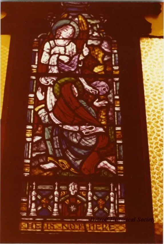 Request ImageColor photograph of an arch-shaped stained glass window depicting a Resurrection scene within Trinity Episcopal Church, taken in July, 1979.