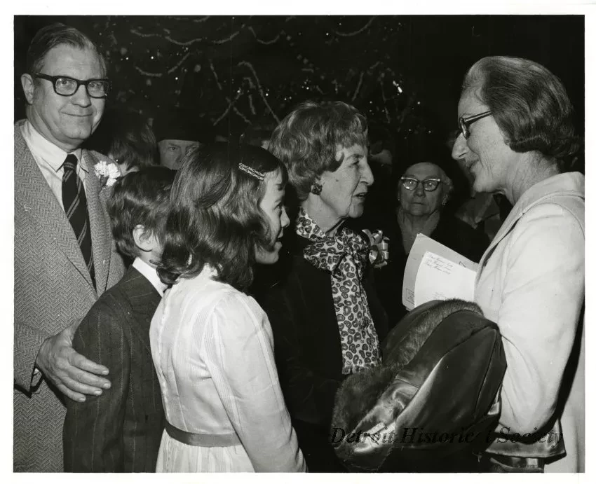 Black and white photograph of Anne Campbell Stark with three relatives--two children, and a man in a suit--speaking to another woman at the dedication of Stark Hall within the Detroit Historical Museum.