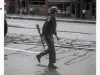 One color photograph which shows stores that were damaged during the 1967 Detroit Riot. The image shows a 2-story brick building with a row of broken storefront windows and debris scattered on the sidewalk. The "I.A.D. New & Used Furniture" store can be seen at the right side of the photo. A Michigan State Police officer is carrying a rifle and is walking along the street in the foreground. Several pedestrians are walking on the sidewalk and reviewing the scene in the background.