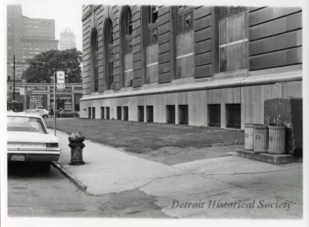 One black and white photograph of the south side of the Detroit Police Department Headquarters building at 1300 Beaubien Street. The view looks westward along Macomb Street toward Beaubien Street.