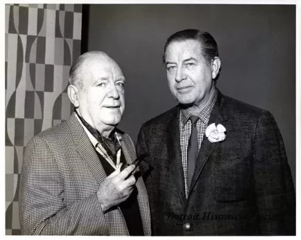 One black and white glossy photograph of actor, Pat O'Brien (left), and Bill Kennedy (right). Both are well-dressed and are standing in front of a backdrop wall that has a contemporary art design. Pat O'Brien is holding a tobacco smoking a pipe in his right hand. Handwritten black pencil text on the verso reads "Pat O'Brien, Tues., Apr., 12, 1966," and "VG [Very Good interview]."
