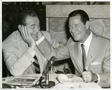 One black and white glossy photograph of Bill Kennedy (left), and actor, Joe E. Brown (right). Both are well-dressed in suits and are seated behind an interview desk with a microphone, ashtray, and notes. A wall and plant are visible in the background. Handwritten blue pen text on the verso reads "Joe E. Brown, 1959." A black ink stamp reads "CKLW-TV Photographic." Additional black ink date stamps range from August 14, 1961, to December 4, 1983, for photo publication dates.