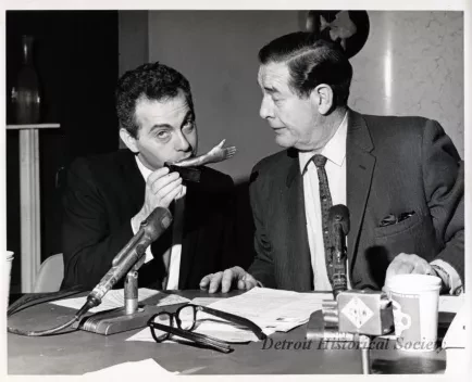 One black and white glossy photograph of comedian, Jackie Mason (left), and Bill Kennedy (right). Both are well-dressed in suits and are seated at a desk with two microphones and notes. Jackie Mason appears to be kissing a small sculpture that depicts a forearm and hand. A backdrop wall is visible in the background. Handwritten pencil text on the verso reads "Jackie Mason - Elmwood [Elmwood Casino, Windsor, Ontario], Tues., Jan. 12, 1965," and "good [interview]."
