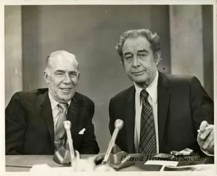 One black and white glossy photograph of screenwriter, playwright, and film director, George Seaton (left), and Bill Kennedy (right). Both are well-dressed in suits and are seated behind an interview desk with two microphones and notes. A plain wall can be seen in the background. Handwritten black pen text on the verso reads "Geo. Seaton (2nd Lone Ranger [radio]), Mon., Mar. 2, 1970," and "not enough time."