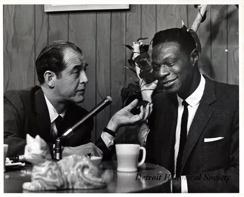 One black and white glossy photograph of Bill Kennedy (left) and singer, Nat "King" Cole (right). Both are well-dressed in suits and are seated behind an interview desk with a microphone, cat figurine, ashtray, and cup. A paneled wall and plant are visible in the background. A black ink stamp on the verso reads "CKLW-TV Photographic."